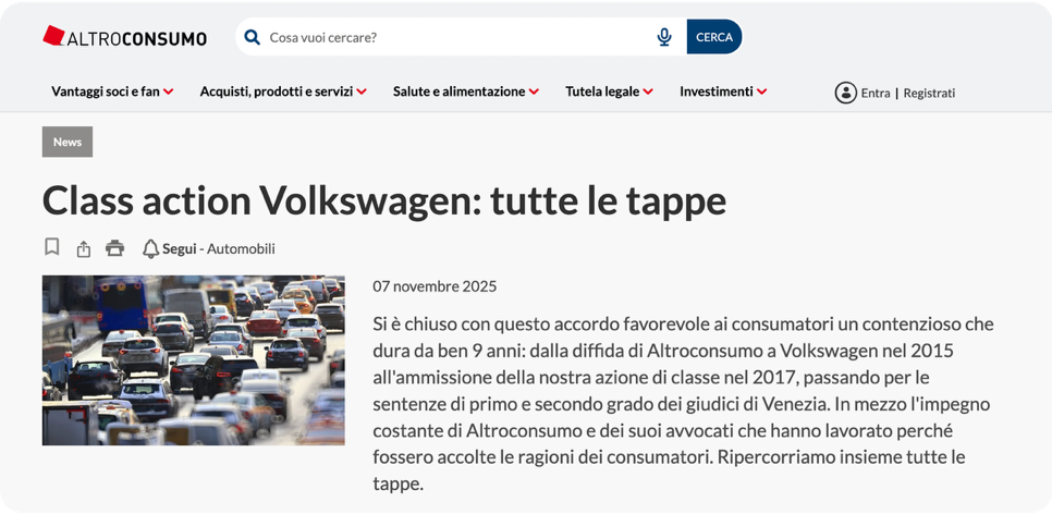 Il 15 maggio 2024 l’associazione per i diritti dei consumatori Altroconsumo e il Gruppo Volkswagen hanno raggiunto un accordo transattivo a conclusione della class action relativa al Dieselgate.